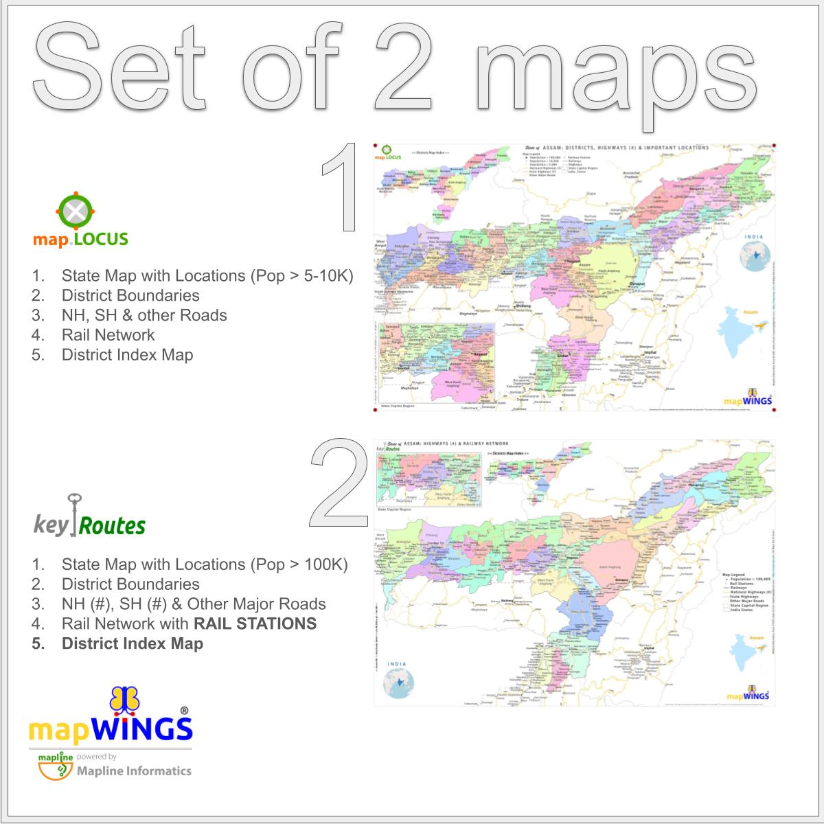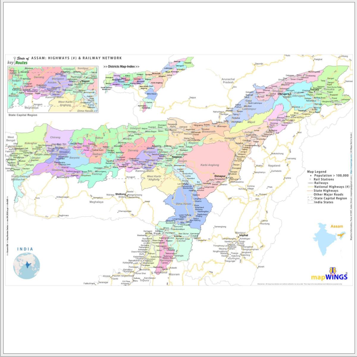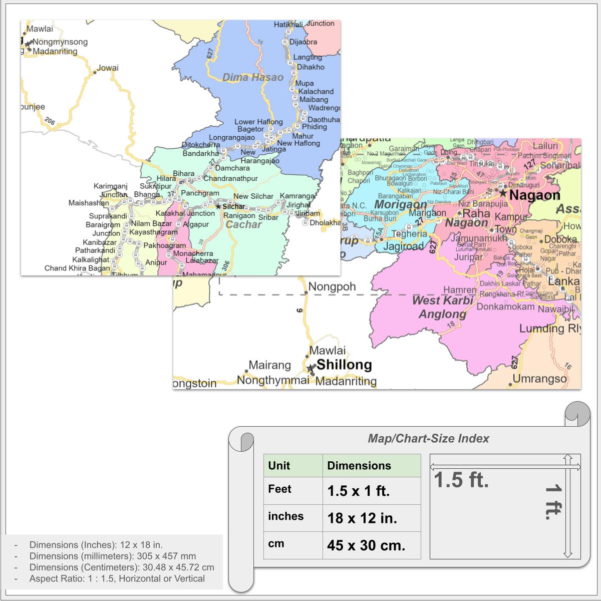 Map of districts of | state of ASSAM | with with Population classified Towns and Locations, Highways (including NH#), Rail and State/District Boundaries with informative map-Legend and Map-Index. The map is printed on Superlative Quality ~MATTE CARD PAPER (150-250 GSM) for clarity, full color and convenient portability.