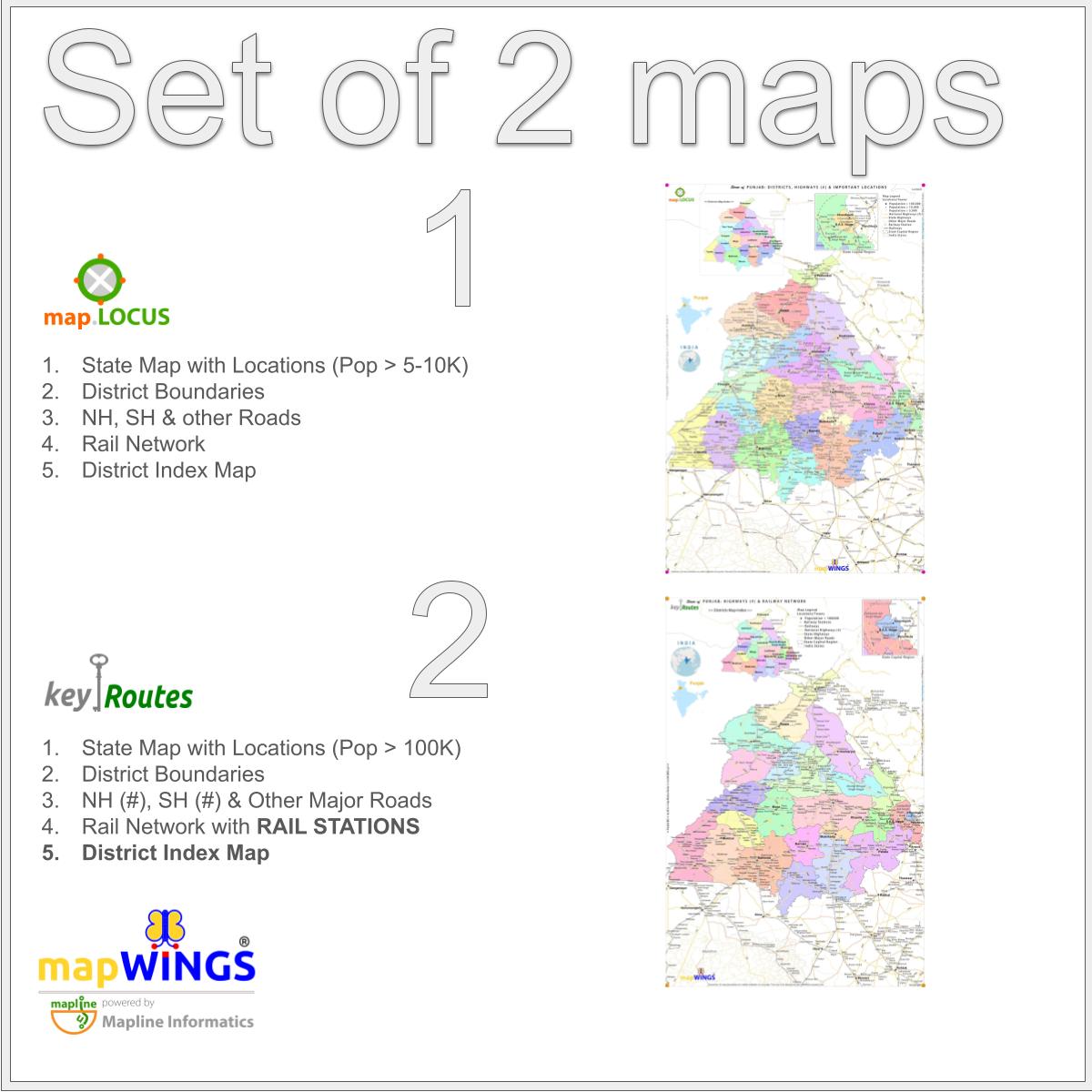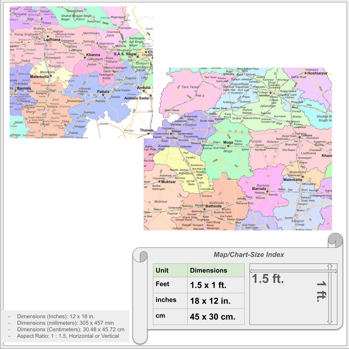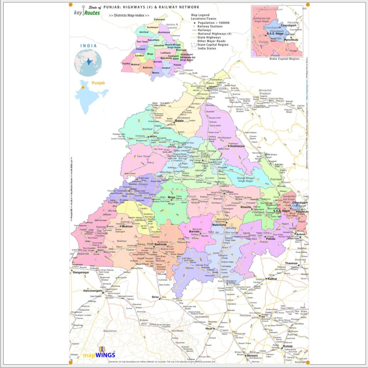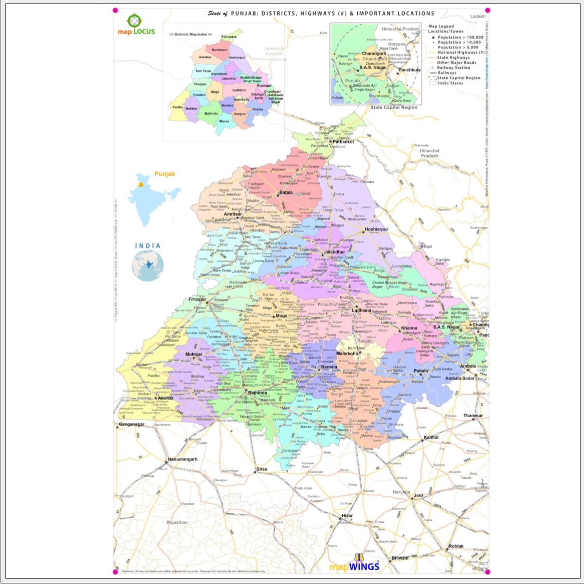 Map of districts of | state of PUNJAB | with with Population classified Towns and Locations, Highways (including NH#), Rail and State/District Boundaries with informative map-Legend and Map-Index. The map is printed on Superlative Quality ~MATTE CARD PAPER (150-250 GSM) for clarity, full color and convenient portability.