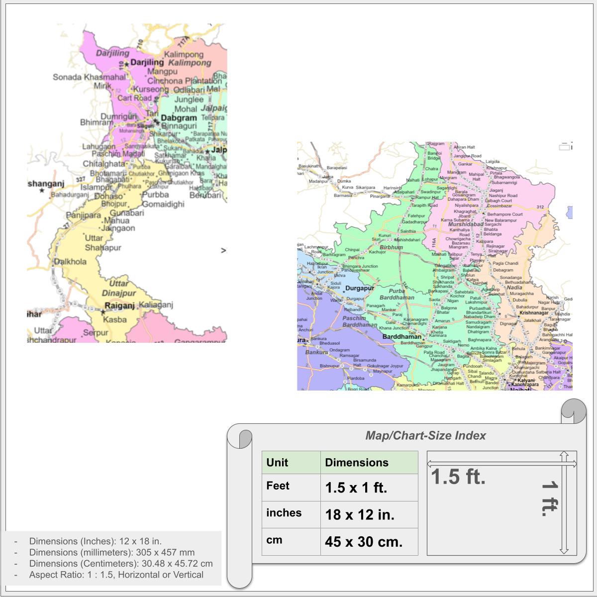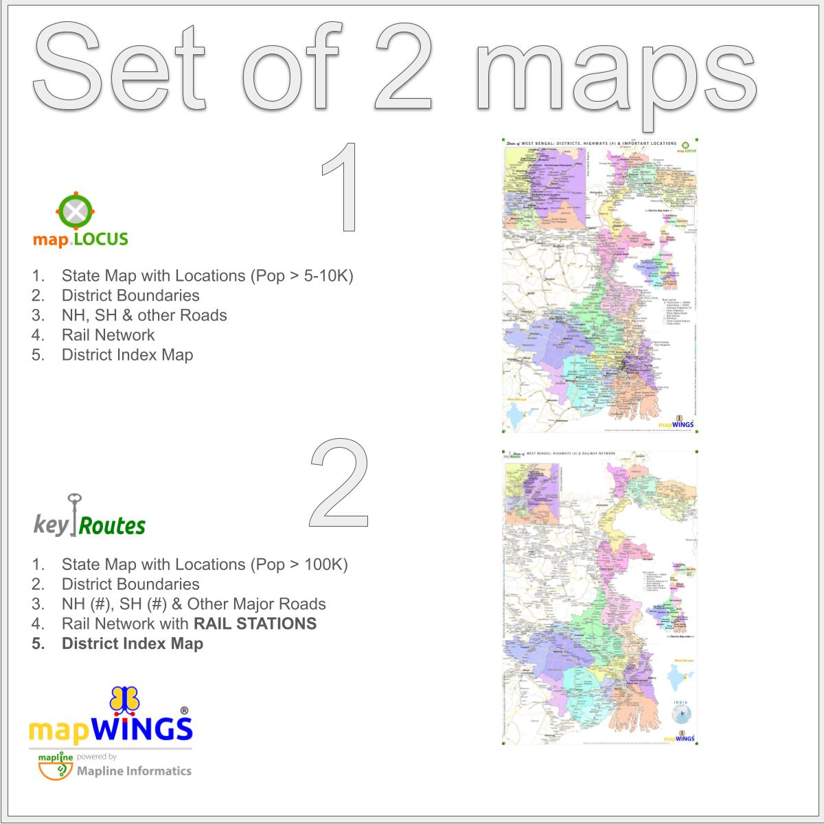 Map for Business & Edu | WEST BENGAL | Set of 2 | 1 – map.LOCUS Map with Districts, Locations, Road, Rail | 2 – key.ROUTES Map with NH, SH & Rail Network | 18 X 12 in