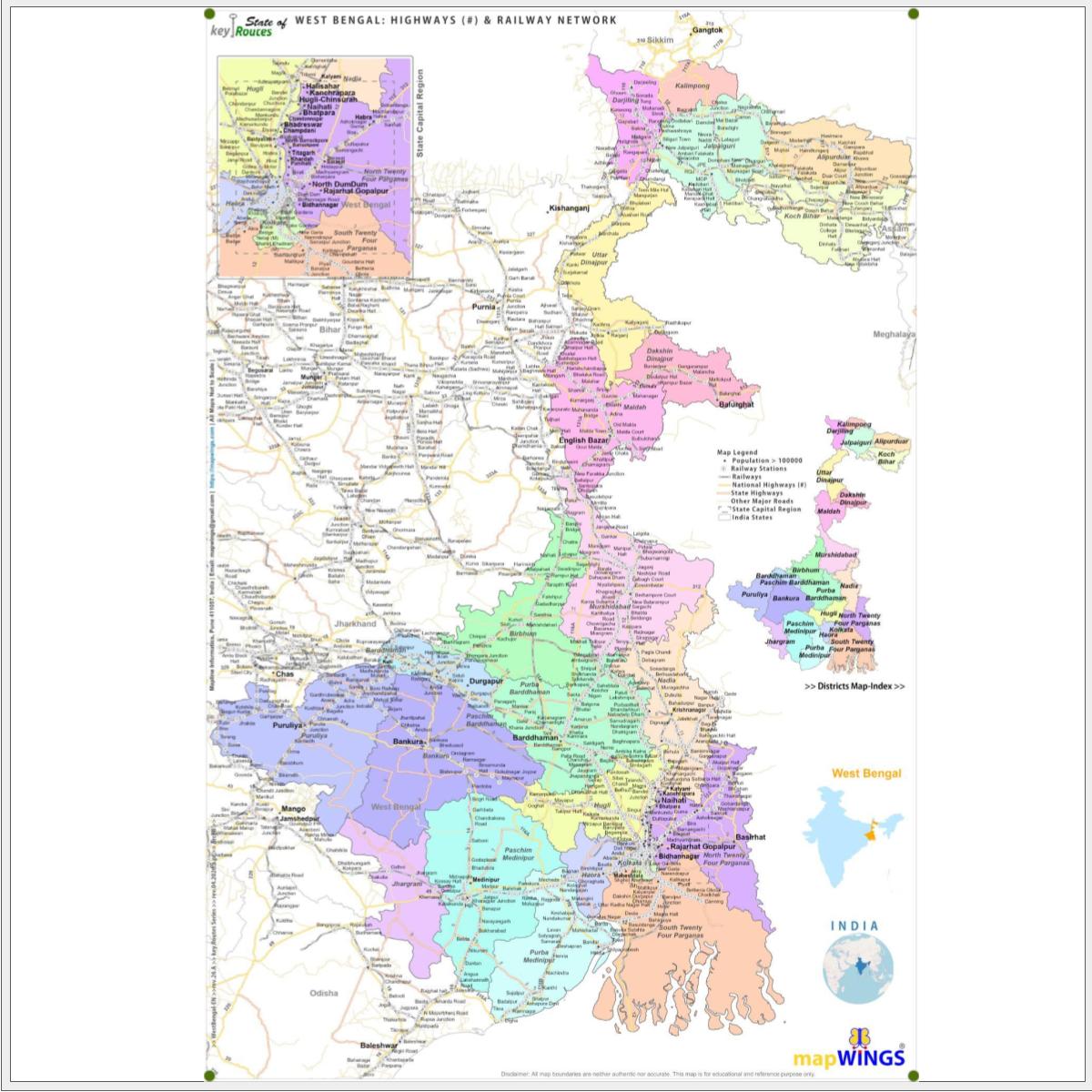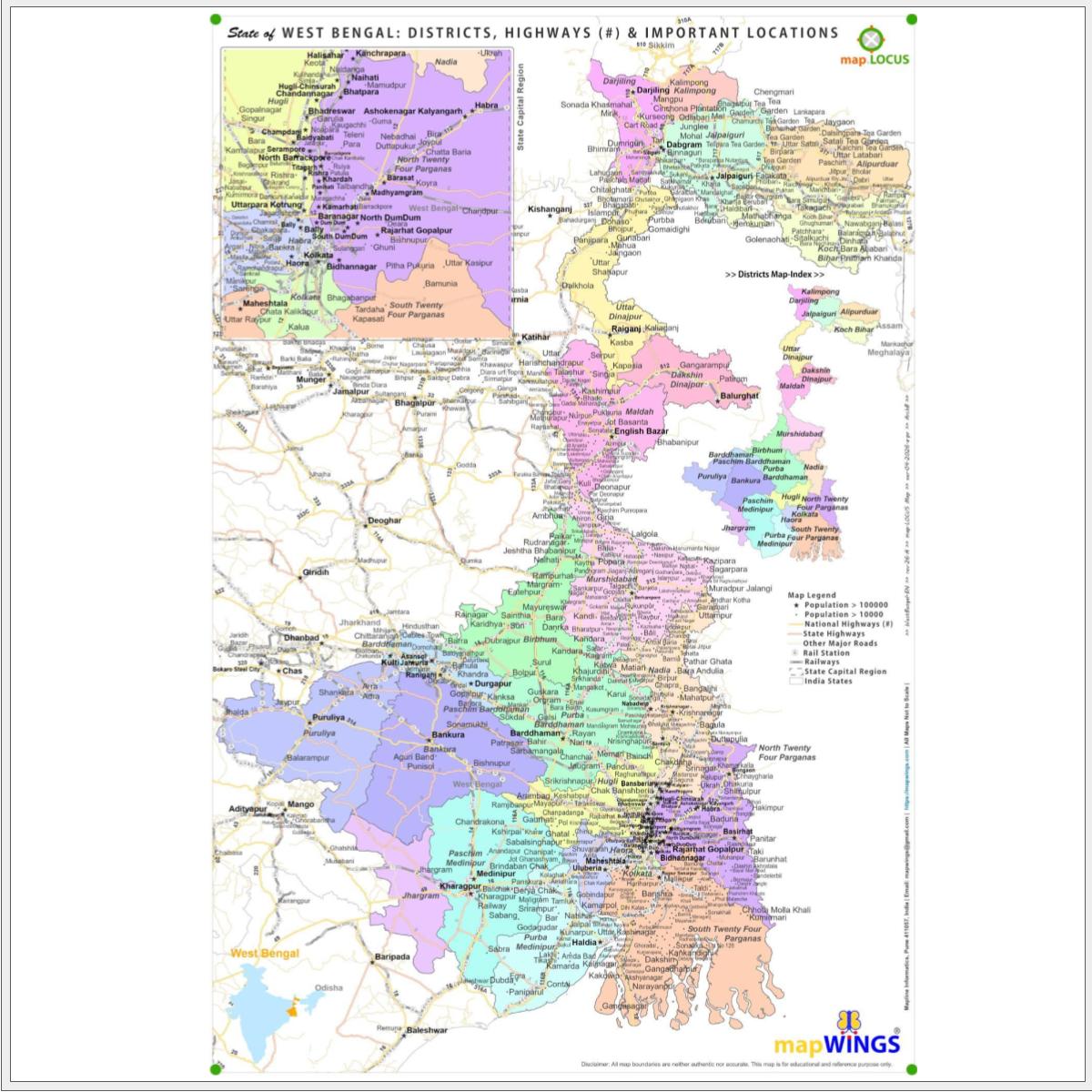 Map of districts of | state of WEST BENGAL | with with Population classified Towns and Locations, Highways (including NH#), Rail and State/District Boundaries with informative map-Legend and Map-Index. The map is printed on Superlative Quality ~MATTE CARD PAPER (150-250 GSM) for clarity, full color and convenient portability.